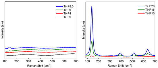 These results of TiO2 formation were confirmed by Raman analysis on all the samples, which are shown in Figure 10. A summary of the Raman signals is presented in Table 3; for the samples Ti-P15 and Ti-P20, well-defined Raman signals were observed at 139.6, 393.4, 513, and 639 cm−1, which are associated with the anatase phase of titanium dioxide; the presence of rutile or brookite phases was not identified. The Ti-P10 sample exhibited a barely perceptible signal at 139.6 cm−1, suggesting the onset of TiO2 crystal nucleation. These results are consistent with the optical micrographs, where white spots observed from 10 V onward indicate the beginning of titanium dioxide crystal nucleation.