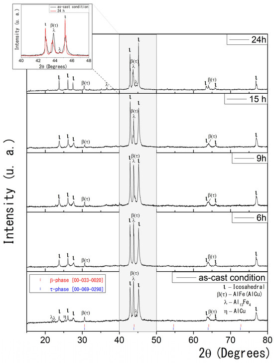 As the heat treatment time increases, the quasicrystalline ι phase in the samples becomes more prominent. This results from stabilizing the icosahedral phase at elevated temperatures over extended periods, promoting its formation. In the 2θ range between 30° and 50° (highlighted in grey), the intensity of the peaks corresponding to the β(τ) and λ phases progressively decreases, while the peaks associated with the ι phase become narrower and more intense. This suggests a phase transformation and improved crystallinity of the thermodynamically stable ι phase. The inset of Figure 1 compares the XRD patterns for the as-cast condition and the sample heat-treated for 24 h.