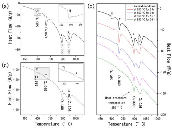 The evolution of heat flow as a function of annealing time for the AlCuFe system is presented in Figure 2b. As the heat treatment time increases, a gradual reduction in heat flow associated with the η and τ phases becomes evident. Notably, after 24 h of heat treatment (Figure 2c), the endothermic peaks at 585 °C and 695 °C are almost entirely suppressed, underscoring the substantial effect of prolonged heat treatments on phase stability and microstructural evolution in Al58Cu27Fe15 alloys.