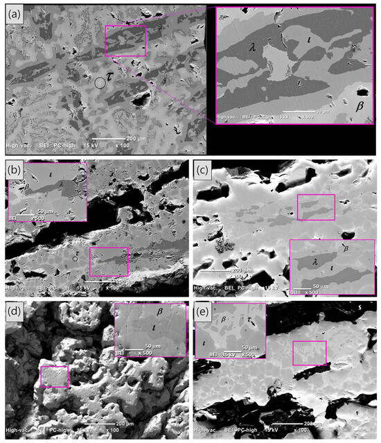 After resolidification at different heat treatments (Figure 3b–e), porosity develops, and the phase distribution changes, with the icosahedral ι and β phases predominantly dominating the resolidified samples in alignment with the previous XRD data presented in Figure 1. Small amounts of the λ and τ phases are also observed; however, as the heat treatment time increases, their presence tends to diminish due to the peritectic reaction between both phases.