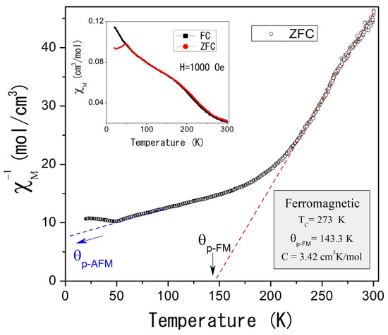 The magnetic properties of self-foaming AlCuFe alloys were investigated using powder samples under Zero Field Cooling (ZFC) and Field Cooling (FC) conditions. Figure 4 illustrates the temperature dependence of the inverse molar magnetic susceptibility, , measured at an applied magnetic field of 1000 Oe in ZFC mode for the as-cast condition sample. The inset of Figure 4 compares the χm(T) response in both ZFC and FC modes, revealing magnetic irreversibility at low temperatures. Below 300 K, the as-cast condition sample displays complex magnetic behavior that follows the Curie–Weiss law.
