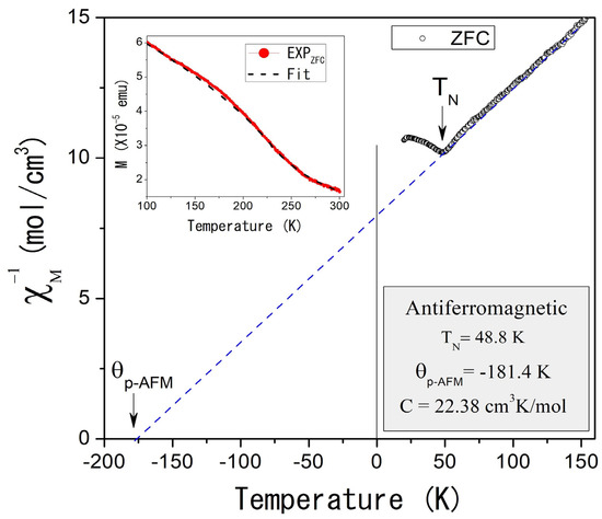 Two distinct magnetic contributions are observed: the first, at higher temperatures (TC = 273 K), indicates ferromagnetic ordering, while the second, at lower temperatures (TN = 48.8 K, Figure 5), suggests antiferromagnetic ordering. Curie–Weiss fitting of the experimental data (dotted straight lines, Figure 4 and Figure 5) reveals paramagnetic Curie temperatures p of 143.3 K and −181.4 K for the ferromagnetic and antiferromagnetic orderings, while the Curie constants were 3.42 cm3 K/mol and 22.38 cm3 K/mol, respectively. That implies magnetic moments of 5.23 µB and 13.03 µB.