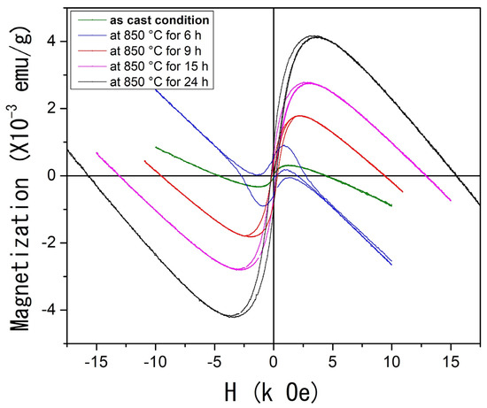Finally, Figure 6 presents the M(H) feature measured at room temperature for both the as-cast condition and the heat-treated samples. The as-cast condition sample displays magnetic behavior that tends toward saturation around 1.3 kOe. Beyond this point, a diamagnetic contribution at higher applied magnetic fields leads the system to exhibit negative magnetization values with no coercive magnetic field.