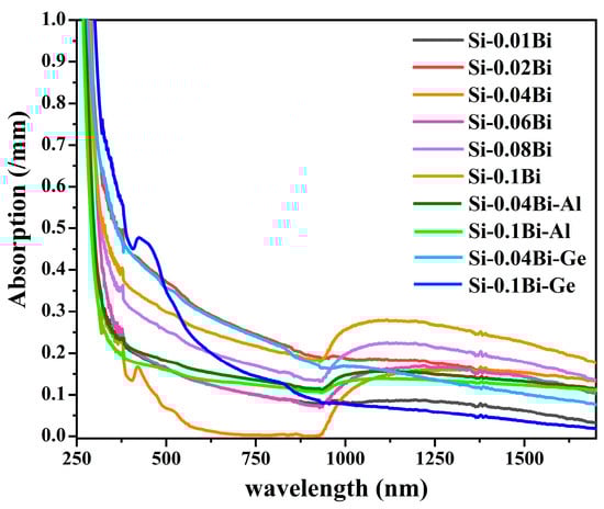 Figure 1 presents the absorption characteristics of Bi-doped, Bi-Al co-doped, and Bi-Ge co-doped silica glasses across the 250–1700 nm wavelength spectrum. In the visible region, six absorption bands were identified at 376 nm, 418 nm, 472 nm, 520 nm, 696 nm, and 830 nm. Notably, a broad absorption band spanning the near-infrared (NIR) region from 930 nm to 1700 nm was observed. This NIR broadband absorption is attributed to the reabsorption phenomenon of BLCs within the glass matrix. Furthermore, the absorption intensity in the NIR region exhibited an enhancement with increasing bismuth doping concentration.