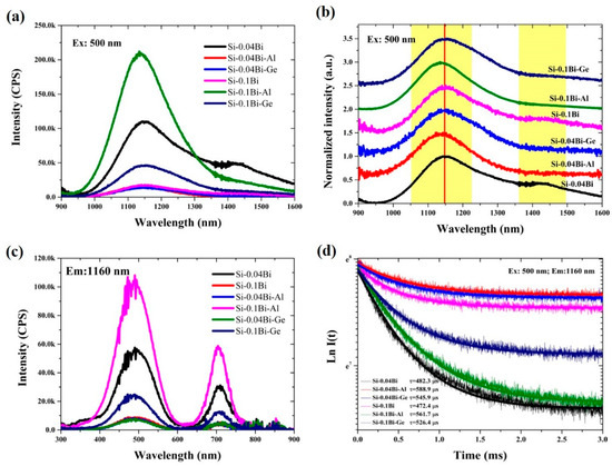 (a,b) The NIR fluorescence and normalized NIR fluorescence spectra excited at 500 nm of Si-0.04Bi, Si-0.04Bi-Al, Si-0.04Bi-Ge, Si-0.1Bi, Si-0.1Bi-Al, and Si-0.1Bi-Ge glasses, The red vertical line and yellow area in subfigure (b) are the emission peaks of the sample; (c) excitation spectra when monitoring the emission wavelength at 1160 nm of Si-0.04Bi, Si-0.04Bi-Al, Si-0.04Bi-Ge, Si-0.1Bi, Si-0.1Bi-Al, and Si-0.1Bi-Ge glasses; (d) fluorescence decay curves at 1160 nm excited at 500 nm for Si-0.04Bi, Si-0.04Bi-Al, Si-0.04Bi-Ge, Si-0.1Bi, Si-0.1Bi-Al, and Si-0.1Bi-Ge glasses.