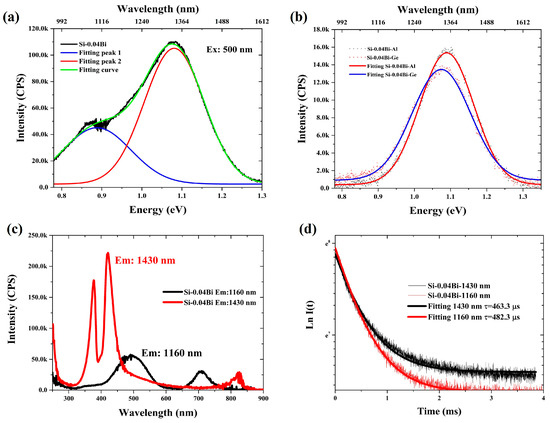 (a) Fluorescence and Gaussian fitting spectra of Si-0.04Bi glass; (b) fluorescence and Gaussian fitting spectra of Si-0.04Bi-Al and Si-0.04Bi-Ge glasses; (c) excitation spectra of Si-0.04Bi glass when monitoring the fluorescence wavelength at 1160 and 1430 nm; (d) Fluorescence decay curves for 1160 nm emission excited at 500 nm and for 1430 nm emission excited at 418 nm for Si-0.04Bi silica glass.