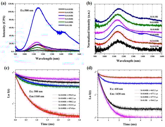 (a,b) the NIR fluorescence and normalized fluorescence spectra of Bi-doped silica glasses with concentrations from 0.01 to 0.1 mol%; (c,d) the fluorescence decay curves of 1160 nm and 1430 nm along with the Bi concentration.