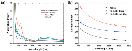 (a) Absorption spectrum of Si-0.1Bi-fiber and Si-0.1Bi-Al-fiber glasses; (b) Cauchy dispersion diagram of silica, Si-0.1Bi-fiber, and Si-0.1Bi-Al-fiber glasses.