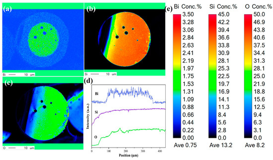 The microstructure and element distribution of the Si-0.1Bi-fiber were studied by EPMA, and Figure 6a–c shows the EPMA surface scan of the fiber core and the surrounding area of the Si-0.1Bi-fiber sample. It can be seen that the bismuth element is mainly distributed in the fiber core area without obvious diffusion. Figure 6d shows the EPMA line scan of the fiber core and the surrounding area of the fiber sample. It can be concluded that the bismuth element is uniformly distributed in the fabricated Si-0.1Bi-fiber glass. The Bi content in the fiber core was about 0.1381 mol%. There were some air holes in the glass fiber owing to unoptimized fiber drawing techniques.