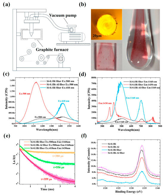 (a) The diagram of the employed method for obtaining Bi-doped glasses and fibers; (b) the photos of the end face of the Si-0.1Bi-Al glass fiber, the glass rod, and polished glass; (c,d) the NIR fluorescence and excitation spectra of Si-0.1Bi-fiber and Si-0.1Bi-Al-fiber; (e) Fluorescence decay curves of the 1160 nm and 1430nm emission for Si-0.04Bi-fiber and Si-0.04Bi-Al-fiber; (f) XPS spectra of Bi 4f7/2–5/2 of Si-0.1Bi-fiber and Si-0.1Bi-Al-fiber.