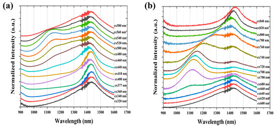 (a,b) The NIR fluorescence spectra of Si-0.1Bi-fiber under the excitation wavelength from 320 to 840 nm.