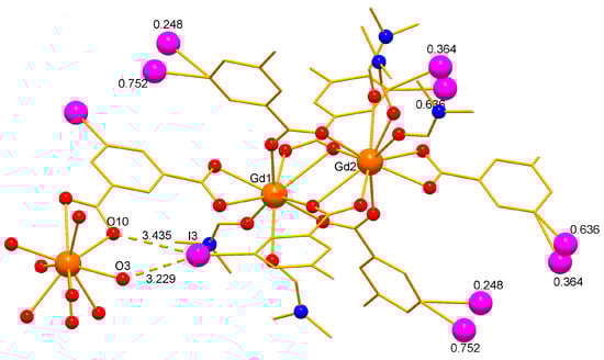 Building block of 1. Gd atoms are orange, O red, N—blue. At disordered I atoms (violet), occupancies are given for each position. I···O contacts dashed.