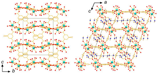 For a long time, metal–organic frameworks (MOFs) remain one of the major topics in modern coordination chemistry and related materials science, attracting numerous research teams from all over the world [1,2,3,4,5,6,7]. This interest is related to numerous useful properties demonstrated by this class of hybrid porous materials. They can be used in separation of complex mixtures of gases [8,9,10,11,12,13,14] and/or liquid organic substrates [15,16,17,18], catalysis [19,20], design of sensors [21,22,23], etc. Using combinations of organic linkers of different topology, it is possible to prepare coordination polymers of highly diverse structural types, thereby providing virtually unlimited opportunities for molecular design of desired 3D MOFs.