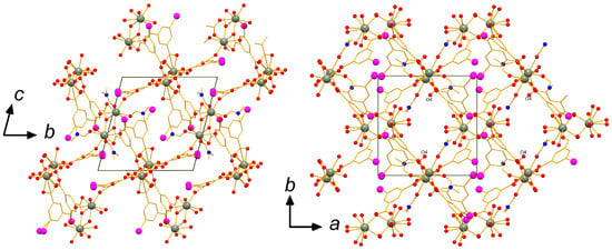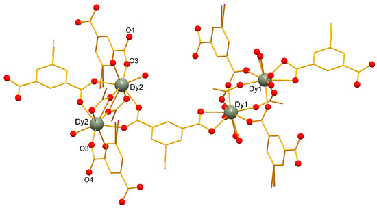 For structure 2, all I atoms were refined with total occupancy 0.95, since it resulted in a much better refinement quality. However, other techniques suggest that 5-iodoisophtalic acid used in experiments was pure. In 2, there are two slightly different dimeric building blocks around two crystallographically independent Dy atoms (Figure 3). Atom Dy1 is surrounded by 4 bridging, two chelating 5-iip units and two disordered DMF molecules. In contrast, DMF molecules coordinated to Dy2 are not disordered. In addition, one of the 5-iisoPh molecules connected only through one oxygen atom—Dy2-O3 distance is 2.235 Å, which is the shortest for 1 and 2. Interestingly, “free” O4 atom is not involved in any kind of non-covalent interactions while facing into the accessible void (Figure 4). The size of these voids is even smaller than in 1 (3.5% for 2 80.6 Å3/cell); they are filled with DMF (1/3 occupancy) molecules.