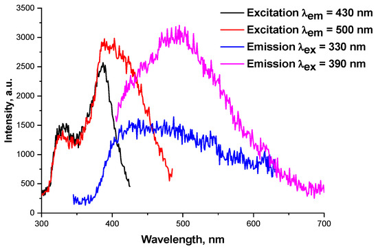The solid-state luminescence spectra of 1 demonstrate multiple emissions (Figure 5) with the band maxima at ca. 500 nm and the band maxima at ca. 400 nm. The spectra of the complex 1 is practically identical to the spectra of the ligand [52]. In both cases, the excited state lifetime in the nanosecond domain points to intraligand transitions.