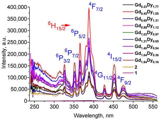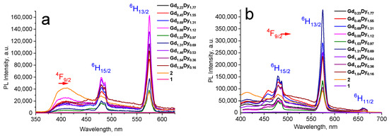 The emission spectra 1, 2 and series of [GdxDy2−x(5-iip)3DMF2]·0.33DMF under the pumping λex of 325 nm (a) and 386 nm (b).