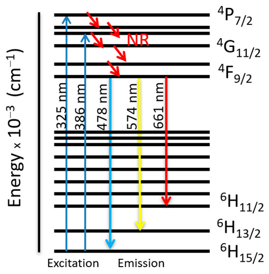 Figure 8 shows the energy transfer processes of Dy3+ ions. Under the 325 nm and 386 nm excitation, Dy3+ ions absorb the photon energy and transfer it from the ground state 6H15/2 to the metastable excited states. During this process, the excited populations are rapidly released at the 4F9/2 energy level by a non-radiative (NR) process that occurs between the excited states. The transitions 4F9/2-6H15/2, 4F9/2-6H13/2, 4F9/2-6H11/2 are radiative and produce the emission peaks at 478, 574, and 661 nm, respectively. The concentration of Dy3+ ions does not clearly influence the PL intensities of complexes, but the broadband emission in the spectra affected the colorimetric parameters.