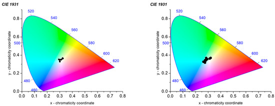 In order to determine the color parameters, the CIE coordinates (x,y) and the correlated color temperature parameter (CCT) were obtained using the standard formula. The chromaticity coordinates can be calculated by using OSRAM color calculator software (version 7.77). The CCT was determined by using McCamy empirical formula [53]: