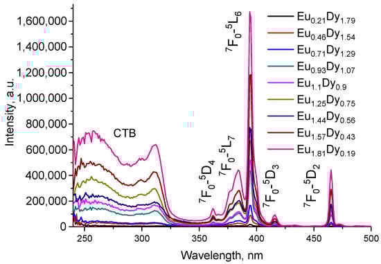 The excitation spectra (λem = 618 nm) for the complexes [EuxDy2−x(5-iip)3DMF2]·0.33DMF, T = 300 K.