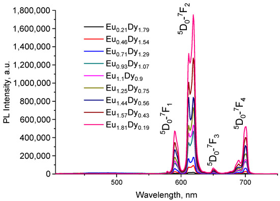 The PL spectrum (Figure 11) consists of the standard in electronic rearrangements within the f–f transitions of europium, corresponding to the transitions from 5D0→7FJ transition’s bands. The transition 5D0→7F2 (electric-dipole transition) at around 618 nm is the most prominent; rest 7FJ (J = 0, 1, 3, 4) bands are not very intense. It is well known that the symmetry position of the Eu3+ ion in the host can influence the characteristic emission. If the Eu3+ ions are located at the inversion symmetric site in the host, the magnetic dipole transition (5D0 → 7F1) dominates. When Eu3+ ions are located at the antisymmetric site (5D0 → 7F2), it promotes magnetic dipole transition. It can be seen from Figure 11 that the strongest peak located at 618 nm (5D0 → 7F2) peaks corresponds to red emission. So, Eu3+ ions are located at anti-symmetry sites of the host lattice. The intensity of the 5D0 → 7F2 band of the electronic transition increases with decreasing symmetry of the environment of Eu3+ ions. Depending on the symmetry of the local environment and the degree of its distortion, the intensity ratio R = 5D0 → 7F2/5D0 → 7F1 is presented in the Table S5.