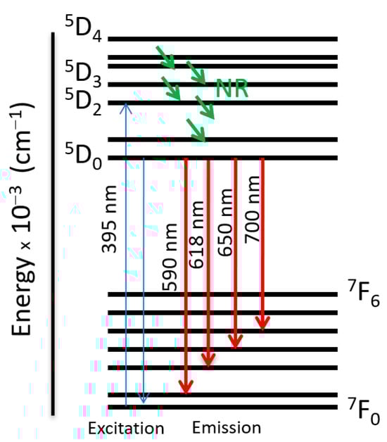 Figure 13 illustrates the partial energy level diagram of Eu3+ in complexes. Under the excitation of 395 nm wavelength, the electron absorbs energy and gets excited to the higher excited states of Eu3+. Finally, the excited electrons fall to the ground state by emitting red emissions through 590 nm (5D0 → 7F1), 618 nm (5D0 → 7F2), 650 nm (5D0 → 7F3), 700 nm (5D0 → 7F4) transitions of Eu3+ ions.