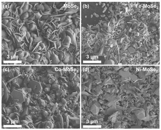 SEM images of (a) MoSe2, (b) Fe-MoSe2, (c) Co-MoSe2, and (d) Ni-MoSe2.