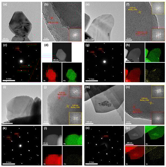 (a,b) HRTEM images of MoSe2, with the corresponding FFT in the red box. (c) SAED pattern of MoSe2. (d) STEM-HAADF image and EDS elemental mapping of Mo and Se. (e,f) HRTEM images of Fe-MoSe2, with the insets showing the corresponding FFT patterns. (g) SAED pattern of Fe-MoSe2. (h) STEM-HAADF image and EDS elemental mapping of Mo, Se, and Fe. (i,j) HRTEM images of Co-MoSe2, with the insets showing the corresponding FFT patterns. (k) SAED pattern of Co-MoSe2. (l) STEM-HAADF image and EDS elemental mapping of Mo, Se, and Co. (m,n) HRTEM images of Ni-MoSe2, with the insets showing the corresponding FFT patterns. (o) SAED pattern of Ni-MoSe2. (p) STEM-HAADF image and EDS elemental mapping of Mo, Se, and Ni.