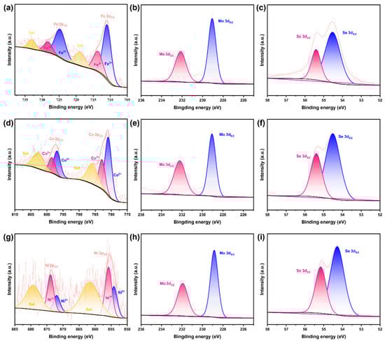 Notably, as illustrated in Figure 3b,e,h for Mo 3d and Figure 3c,f,i for Se 3d, the XPS spectra of Mo 3d and Se 3d show that, regardless of Fe, Co, or Ni doping, the Mo 3d5/2 peak remains at 229.5 eV, the Mo 3d3/2 peak at 232.5 eV, and the Se 3d5/2 and Se 3d3/2 peaks at 54.5 eV and 55.5 eV, respectively. This clearly indicates that the doping process has a minimal effect on the chemical states of Mo and Se, and that the Mo-Se skeleton structure of MoSe2 remains highly stable. Additionally, quantitative analysis results show that the contents of Fe, Co, and Ni are 9.01%, 5.44%, and 2.24%, respectively, further confirming the successful implementation of the doping process.