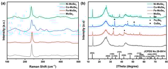 (a) Raman scattering spectra and (b) XRD patterns of Fe/Co/Ni-MoSe2 and MoSe2.