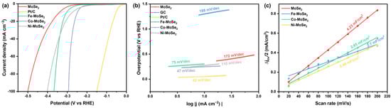 Electrochemical tests were performed using a CHI660E electrochemical work station (manufactured by Shanghai Chenhua Instrument Co., Ltd., Shanghai, China). GC electrodes loaded with Fe-, Co-, and Ni-doped MoSe2 catalysts were used as the working electrodes, with Ag/AgCl and Pt electrodes serving as the reference and counter electrodes, respectively. All potentials were referenced to the reversible hydrogen electrode (RHE), calculated using the following formula: ERHE = E(Ag/AgCl) + 0.059 pH + 0.197 V. LSV was carried out in a 0.5 M H2SO4 solution at a scan rate of 50 mV/s, with a 95% ohmic drop (IR) correction applied to all results. The Tafel slope, derived from the LSV curves, was used to evaluate the electrocatalytic reaction kinetics. Additionally, CV was performed in the potential range of 0–0.2 V vs. RHE at various scan rates (20–200 mV/s) to determine the double-layer capacitance.