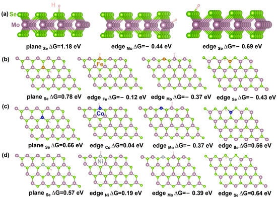 To gain deeper insights into the active sites of Fe-, Co-, and Ni-doped MoSe2 (M-MoSe2) in the HER, we performed density functional theory (DFT) calculations on Fe-MoSe2, Co-MoSe2, Ni-MoSe2, and pristine MoSe2. The catalytic activity was evaluated using the ΔGH, which reflects the hydrogen adsorption capability on the material surface. An effective HER catalyst typically exhibits a ΔGH value close to zero, indicating moderate hydrogen adsorption strength that facilitates efficient HER. A ΔGH that is too positive (weak adsorption) or too negative (strong adsorption) would hinder the reaction. Thus, the ideal HER catalyst should have ΔGH ≈ 0 eV.