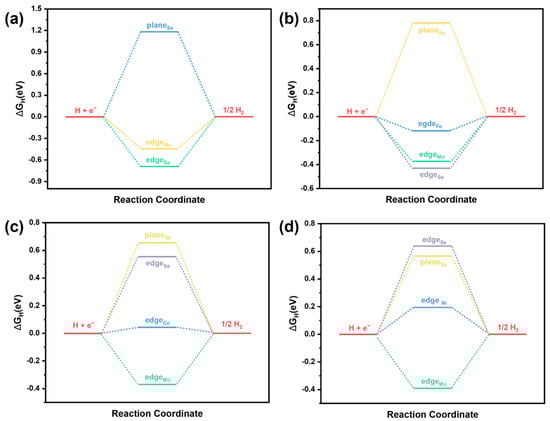 In this study, we analyzed multiple potential hydrogen adsorption sites on M-MoSe2, including basal plane Se sites (plane Se), metallic edge Mo sites (edge Mo), and non-metallic edge M/Se sites (edge M/edge Se). For comparison, we also calculated hydrogen adsorption on pristine MoSe2 at basal plane Se sites (plane Se), metallic edge Mo sites (edge Mo), and non-metallic edge Se sites (edge Se). The optimized structure is shown in Figure 6, and the calculated ΔG value is shown in Figure 7.