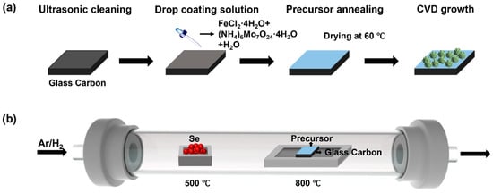 Fe-, Co-, and Ni-doped MoSe2 were synthesized using the chemical vapor deposition method (Figure 8a). Initially, a 1 cm × 1 cm GC was sonicated in distilled water and ethanol for 10 min each to remove surface impurities. The precursor solution was prepared as follows: (NH4)6Mo7O24·4H2O was dissolved in 1 mL of water to obtain a 0.0121 mol/L solution, which contained approximately 8.16 mg Mo per mL. For doping purposes, FeCl2 (0.146 mol/L, ~8.16 mg Fe/mL), CoCl2·6H2O (0.139 mol/L, ~8.16 mg Co/mL), and NiCl2 (0.139 mol/L, ~8.16 mg Ni/mL) were each dissolved in 1 mL of deionized water. Approximately 4–5 drops (equivalent to ~0.200–0.250 mL) of the precursor solution were uniformly drop-cast onto the surface of a pre-cleaned 1 cm × 1 cm GC, forming a full surface coverage. The sample was then dried at 60 °C for 1 h.