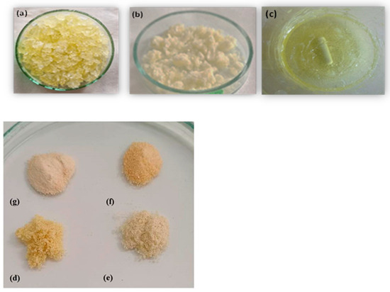 Pictures of binary gels: (a) 90TiO2/10ZnO, (b) 10TiO2/90ZnO (c) 50TiO2/50ZnO, (d) Pd/TiO2, (e) Pd/90TiO2/10ZnO (f), Pd/50TiO2/50ZnO and (g) Pd/10TiO2/90ZnO.