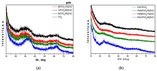Bright and homogeneous gels were obtained and the gelation occurred immediately. Their visual observations of the gels and Pd modified samples are shown in Figure 1a–g. According to the XRD results all samples are amorphous (Figure 2a). Additionally, we have performed the XRD analysis of the Pd-modified photocatalysts (Figure 2b). As it is seen from the figure, the peak positions were not changed despite the addition of palladium to the TiO2 framework. The absence of peaks corresponding to Pd, PdO, and PdO2 suggests that the palladium ions were incorporated into the titanium anatase structure. In particular, the decreasing of the intensity of the amorphous halo as well as its broadening could be a proof for the substitution of titanium ions. These results well corelate with those obtained by other authors [38,39]. Information for the samples surface was obtained by BET measurements. The prepared gels showed specific surface value about 30 m2/g, while pure TiO2 obtained from Ti(IV) butoxide exhibited about 70 m2/g.