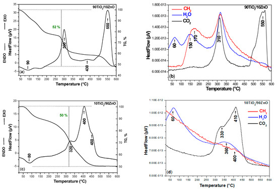 In order to verify the thermal stability of the TiO2/ZnO nonannealed catalysts, the DTA-TG analysis was conducted. The DTA/TG curves of the prepared nonannealed dried gels, are presented in Figure 3a–d. As it can be seen, several peaks are marked on the DTA/TG curves for both samples. The DTA-TG of the pure TiO2 obtained from the Ti(IV) butoxide is not considered in this paper as it has been published elsewhere [40]. Generally, one endothermic peak is observed about 80–90 °C which is to the evaporation of physically adsorbed water (Figure 3a,c). When the temperature is increased the first exothermic peak is observed about 300–320 °C related to the decomposition of the organics. As it is seen from the figure the combustion process occurred more intensively in the sample 90TiO2/10ZnO due to the presence of higher Ti(IV) butoxide amount. In the other 10TiO2/90ZnO sample, this peak is weaker and could be related to the beginning of the thermal decomposition of the ZnO precursor [41,42]. The second exothermic peak is detected at ~400–430 °C and it is sharper in the sample containing higher ZnO content perhaps due to the stronger release of the organics (Figure 3c). According to the TG curves in both samples these peaks are accompanied by a strong weight loss ~50% for both samples and the processes finished at nearly 450 °C. The last exothermic effects at 450 and 500 °C observed in samples 90TiO2/10ZnO and 10TiO2/90ZnO, respectively. Bearing in mind these experimental facts, it could be assumed that these last effects could be related to the oxidation of residual carbon and release of CO2. On the other hand, Siwińska-Stefańska et al. [41] stated that the exothermic effects above 300 °C of the TiO2-ZnO hybrids is due to the thermal decomposition of unreacted zinc acetate. The results have shown that the obtained TiO2/ZnO gels exhibited relatively good thermal stability. Furthermore, titanium dioxide and zinc oxide following thermal degradation have similar thermal stability comparable to that reported in the literature [42,43].