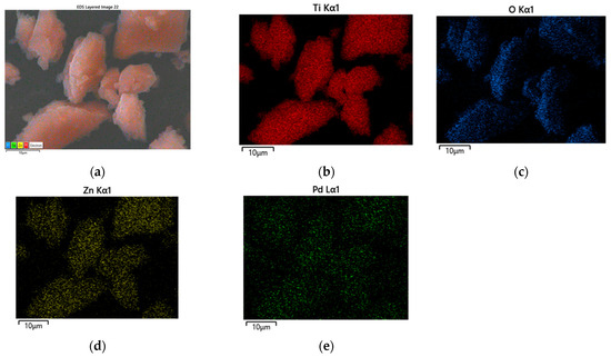 Figure 5a–d represents the surface morphology of Pd modified TiO2/ZnO samples. Generally, there is no change in the morphology of the examined samples after the addition of Pd. It depicts distribution of irregular and well-shaped particles with a certain degree of agglomeration. Perhaps palladium is deposited over the surface of TiO2/ZnO gels which was already stated by several authors [44,45]. The EDS analysis (Table 1) also confirmed its loading on the samples surface which is related to the expected enhancement of the photocatalytic activity. Figure 6a shows the chemical mapping performed under a scanning microscope for sample Pd/90TiO2/10ZnO which eexhibited best photo-catalytic activity. The chemical mapping for the rest of the samples were similar. The mapping shows a homogeneous distribution of Ti, Zn, Pd and O (Figure 6b–e). The presence of all elements observed in the EDS spectrum is summarize in Table 1.