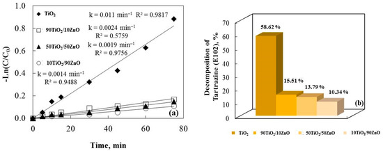 A constant reaction rate for the samples is shown by plotting Ln(C/C0) against irra-diation time in Figure 8a. It is noticeable that increasing the amount of zinc oxide de-creases the photocatalytic efficiency of the no-annealed catalysts. The results demonstrate that TiO2 has a higher efficiency when compared to TiO2/ZnO gels. The causes of these results are unknown, but they most likely result from a complex interaction of various factors. TiO2’s smaller crystallite size and greater surface area cause food coloring to degrade more quickly.