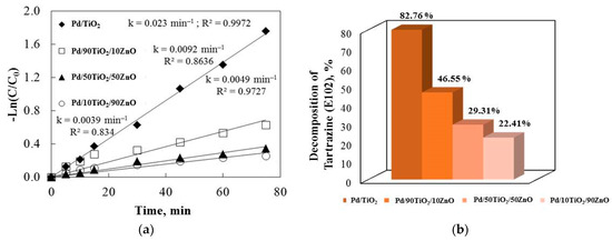 E102 degradation by ultraviolet illumination was used to further examine the catalytic efficiencies of the co-catalytic palladium-modified gels (Figure 9). All of the R2 correlation coefficients were higher than 0.947. The photocatalytic efficiency of co-catalytic modified samples is known to be influenced by a number of factors, such as the synthesis method, band gap, light illumination, crystallite size, surface area, etc. Palladium enhanced the samples’ photocatalytic behavior under ultraviolet illumination, as demonstrated by our photocatalytic experiments.