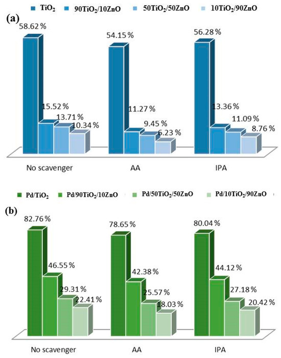 Scavengers’ radical effects on tartrazine breakdown using (a) pure and (b) Pd-modified TiO2, 90TiO2/10ZnO, 50TiO2/50ZnO and 10TiO2/90ZnO gels.