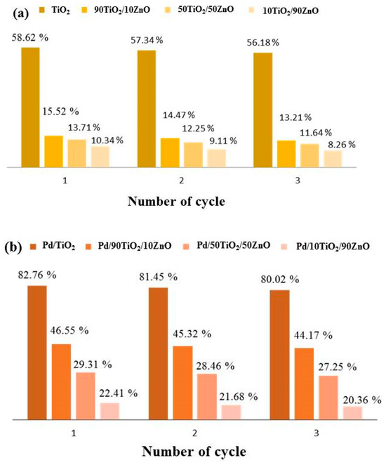 Figure 11 presents the results of a three-cycle investigation into the recyclability of gels composed of pure and palladium photo-fixed TiO2, 90TiO2/10ZnO, 50TiO2/50ZnO, and 10TiO2/90ZnO. The photocatalytic decomposition of tartrazine decreased by roughly 2% for all catalyst types after three cycles in distilled water, indicating a slight decline in the gels’ catalytic capabilities with each cycle. Despite this decline, it was discovered that the sol-gel gels’ dye decomposition cycle stability was good. These outcomes demonstrate their capacity to be used repeatedly in the breakdown of Tartrazine. Even though the photocatalytic activity somewhat declines with repeated use, TiO2 remains the most stable and efficient catalyst over a number of cycles.