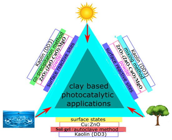 In this study, we have investigated the application of photocatalysis using ceramic materials, focusing on the role of kaolin as a base catalyst and the impact of added oxides like zinc, copper, and magnesium oxide [54]. We utilized various preparation methods, including dip-coating and autoclave techniques for applying thin layers on ceramic substrates [33,51] and deposition and mixing methods for integrating the oxides [52,53]. The objective was to evaluate the effectiveness of these materials and techniques in enhancing photocatalytic performance for environmental pollutant degradation (Figure 1), thereby contributing to the advancement of sustainable technologies for environmental remediation.