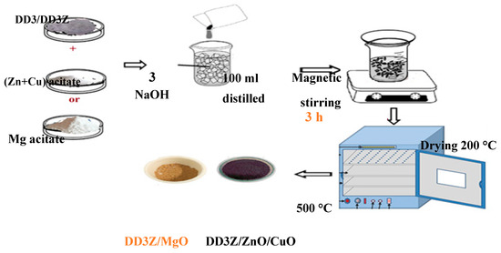 In the co-precipitation method [52] (Figure 4), varying amounts of zinc acetate dihydrate ((CH3COO)2 Zn·2H2O) and copper acetate ((CH3COO)2Cu) were added to the ceramic materials DD3 and DD3 + 38% ZrO2-clay. Specifically, zinc acetate was added at 28 wt.% and 25 wt.% for DD3 and DD3 + 38% ZrO2-clay, respectively, while copper acetate additions were 2.8 wt.% and 12.5 wt.% for the same compositions [52]. The acetates were dissolved in 100 mL of distilled water, followed by adding 3 g of sodium hydroxide (NaOH) to achieve a concentration of 0.5 mol/L in the ceramic and acetate mixture [56,58]. The mixture was stirred at 70 °C for 3 h, causing the formation of metal complex precipitates [59]. The resulting precipitate was filtered under vacuum, washed once with distilled water, and air-dried at 200 °C for 10 min. Subsequently, the dried residue underwent calcination in a Nabertherm oven at 500 °C for 2 h [52,59].