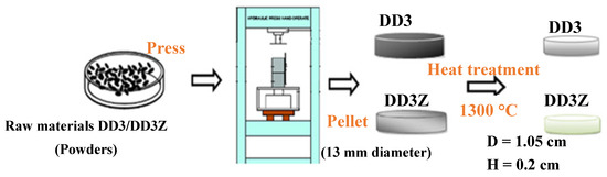 The samples (Figure 5) were prepared using DD3 clay powders, and 38 wt.% zirconium oxide (ZrO2) was added [33], achieving a specific open porosity of 33% through controlled heat treatment. Initially, the mass of 1 g of these powders was determined, followed by compacting them into pellets using a “Specac Oum El bouagi-Algeria” press equipped with a 13 mm radius matrix under 40 MPa pressure [35]. Subsequently, the pellets underwent sintering in an oven at 1300 °C for 2 h, with a gradual annealing rate of 5 °C/min (Figure 5) [33,35]. The next step involved depositing active layers of ZnO and Cu-doped ZnO onto these ceramic substrates, which have dimensions of 10.5 mm in diameter and 20 mm in height, utilizing sol–gel and autoclave techniques to enhance their catalytic properties [33,51].