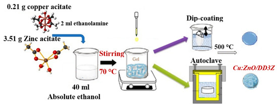 Thin layers of Cu/DD3 and Cu/DDZ are fabricated using the sol–gel [33] and autoclave [51] methods (Figure 9). The X-ray diffraction (XRD) patterns reveal prominent peaks corresponding to zinc in two phases (JCPDS 03-0891) oriented preferentially at (100), (002), and (101) [75] and copper oxide (JCPDS 01-1117) with orientations (11-1) and (111) when using the autoclave method [76]. During the dip-coating process, the substrate’s pores are filled with Cu-doped ZnO [33], and subsequent rearrangement of the deposited crystals induces compressive stress and XRD peaks towards larger angles [33].