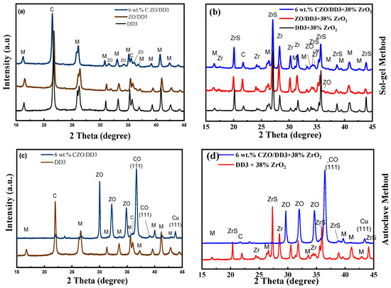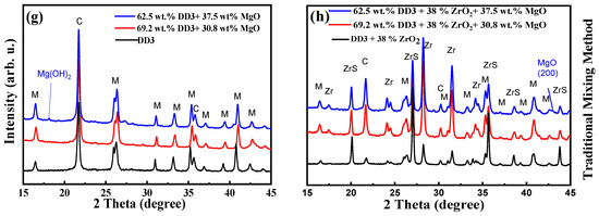 XRD spectra of ceramic powders. Reprinted with permission of [52,53]. ZrS: zircon (ZrSiO4), Zr: zirconia (ZrO2), C: cristobalite (SiO2), M: mullite (3Al2O3, 2SiO2). (a–d) Co-precipitation method, (e–h) traditional mixing method.