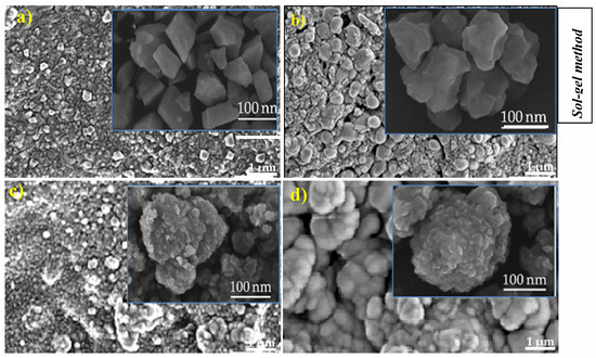 Figure 11 presents SEM images of Cu-doped ZnO (CZO) thin layers deposited on different substrates using sol–gel and autoclave methods [33,51], highlighting distinct morphologies between the two fabrication methods. The sol–gel method results in a predominant flower-like growth pattern with increased surface roughness [33,35], thereby offering a broader active surface area. In contrast, the autoclave method produces thin films characterized by spherical-shaped nanoparticles on the substrate surface [51].