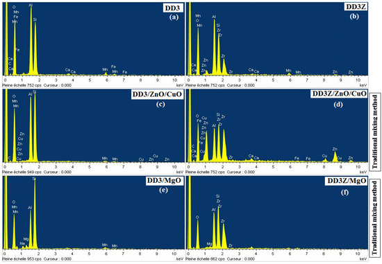 EDS spectrum of ceramic powder after the addition of ZnO, CuO, and MgO. Reprinted/adapted with permission of [52,53]. (a) DD3, (b) DD3 + ZrO2, (c) DD3/28 wt.% ZnO/2.8 wt.% CuO, (d) DD3Z/28 wt.% ZnO/2.8 wt.% CuO, (e) DD3/30.8 wt.% MgO, and (f) DD3 + ZrO2/30.8 wt.% MgO.