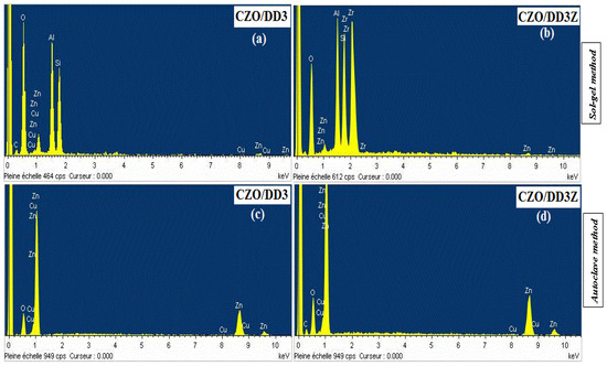 Adding MgO (Table 5) (DD3/MgO) introduces 0.97% Mg and increases Si to 23.71%, while in DD3Z/MgO [53], Mg is only 0.09%, but Zr is 5.75%. These changes demonstrate how the mixing method alters the ceramic composition, with some elements being incorporated more effectively than others [53]. When ceramics are used as a substrate [33,51], the predominant elements are typically silicon (Si), aluminum (Al), and zirconium (Zr). After depositing metal-oxide thin layers, such as zinc (Zn) and copper (Cu), these elements appear in small proportions [33,51]. Specifically, copper is detected in very low amounts when prepared using the sol–gel method (Figure 13) [33]. However, when employing the autoclave method, there is a notable absence of substrate elements, with high percentages of sedimentation elements like Zn and Cu observed instead. This discrepancy is attributed to the thickness of the deposited layers [51], which effectively masks the ceramic substrate [51]. It confirms the intentional doping of zinc oxide layers with copper, emphasizing the active role of these elements in the deposited layers. The table compares samples prepared by dip-coating and autoclave methods [33,51].