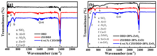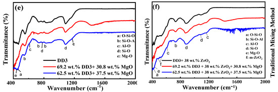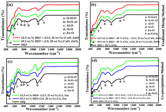 Infrared spectrophotometry is a valuable tool for studying materials’ structures, compositions, and chemical properties [88]. Figure 14 presents the absorption bands observed across the range of 400–2000 cm−1 for ceramic powders (DD3 and DD3Z) with and without varying proportions of MgO, ZnO, and CuO [52,53,54], prepared using traditional mixing and co-precipitation methods and treated at 500 °C for two hours [52,53]. The powders’ spectra indicate distinct features corresponding to mullite–cristobalite (DD3) and mullite–zircon (DD3 + 38% ZrO2) [52,53], consistent with the X-ray analysis results [52,53]. Absorption lines are attributed to bonds such as Al-O, Si-O, Zr-O, and Si-O-Al vibrations.